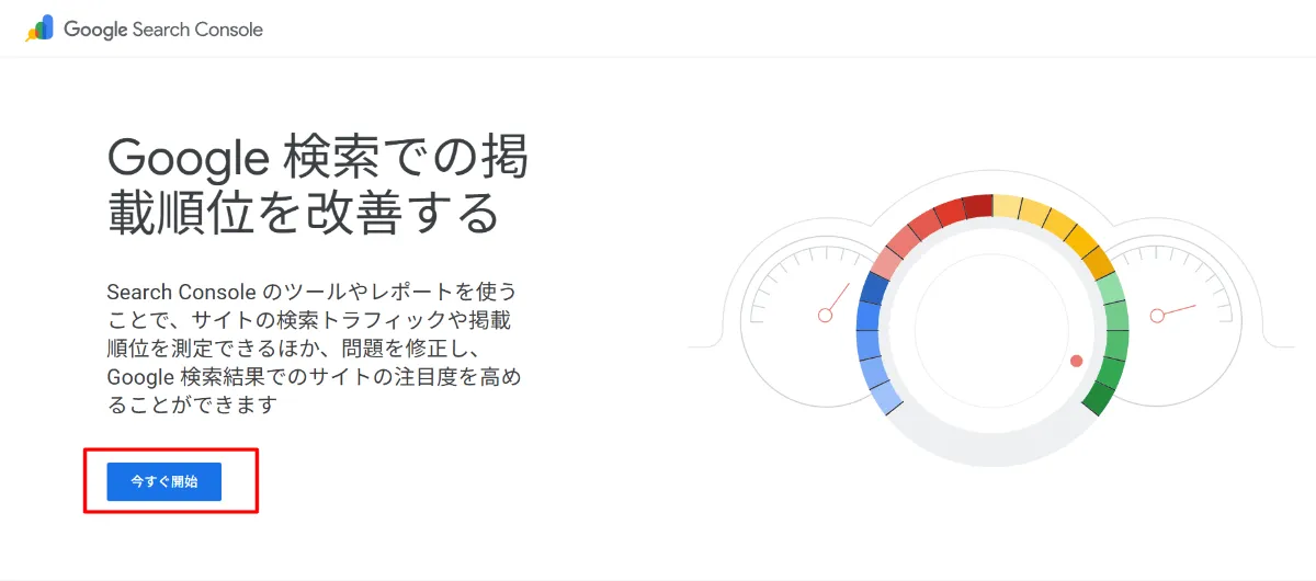 まずは、Googleアカウントでログインした状態で、Googleサーチコンソールの公式ページにアクセスします。画面が表示されたら、「今すぐ開始」などのボタンをクリックして登録を始めます。