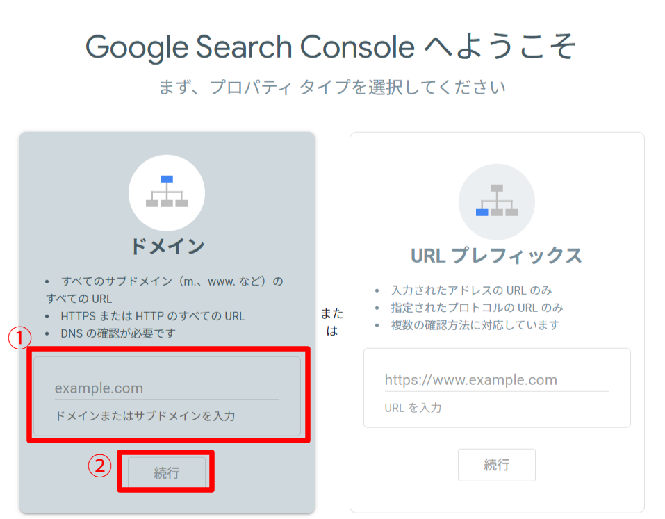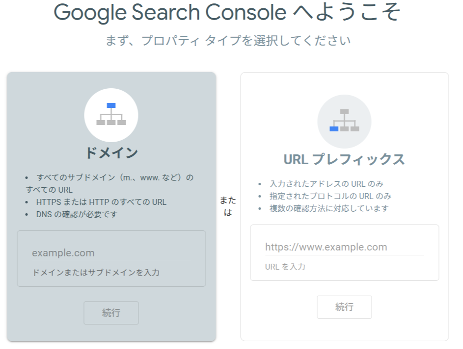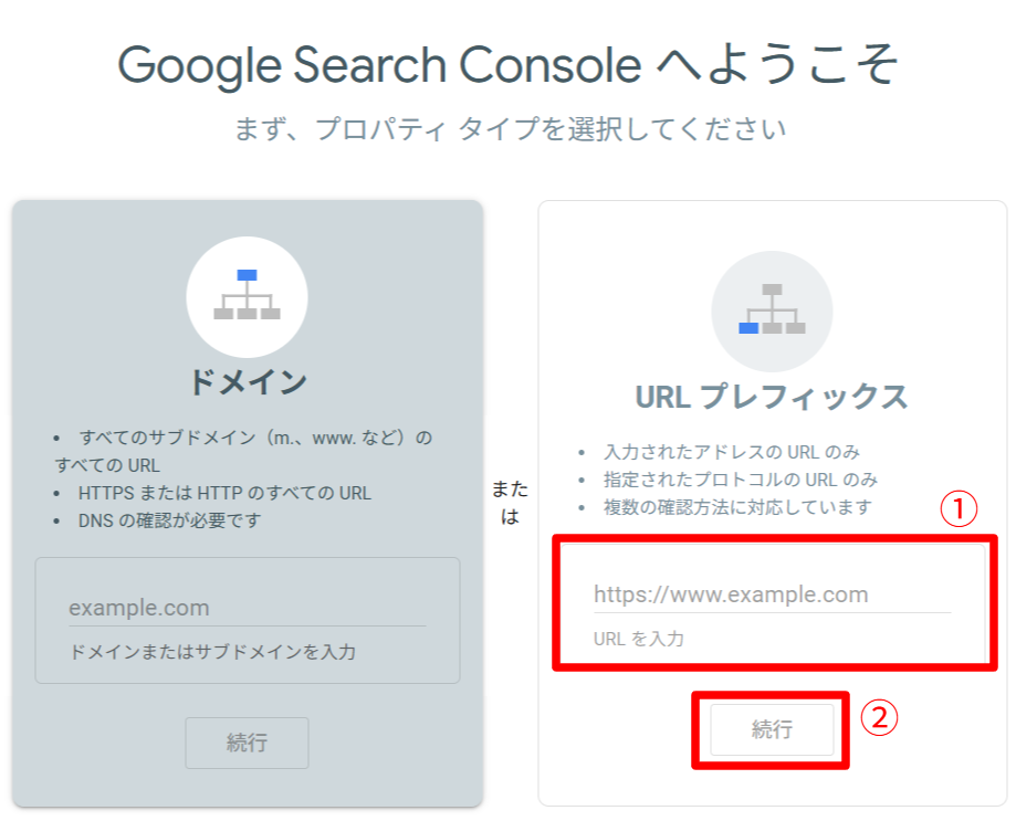 次に、あなたのWebサイトのURLを入力します。このとき、登録方法として「ドメイン」か「URLプレフィックス」のどちらかのプロパティを選ぶ必要があります。