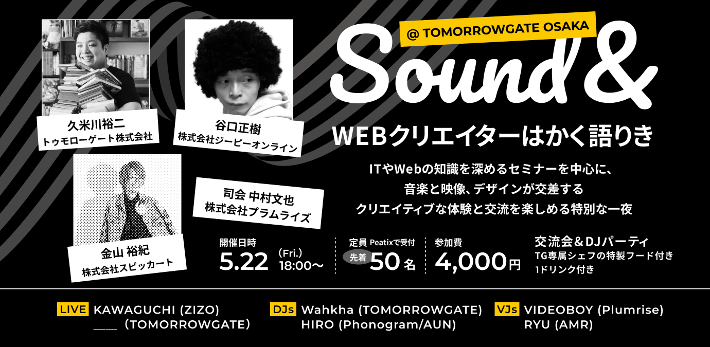 5/22(金) セミナー+交流会のイベント「Sound&」第2回がトゥモローゲート株式会社 大阪本社で開催されます。